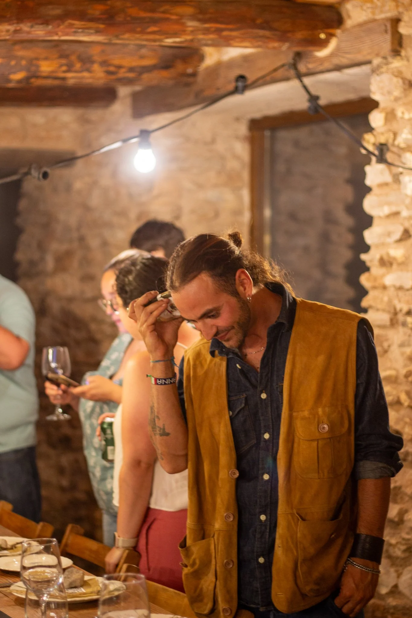 During the last weekend of our time in Murcia, we gathered everyone we had worked with at La Junquera to conclude our research and share our findings. We’ve hosted a dinner for the four shepherds we’ve followed in the past few months and their family’s. Eating together is very bonding, which was precisely the purpose of this evening. The event was an opportunity to thank everyone, including the shepherds and to exhibit fragments of our research. On the long dinner table there were objects and photographs that we’ve collected. And there were quotes on all the plates that told something about the work of the shepherds and their reading of the landscape. On some plates were QR codes to scan that played the different calls of the shepherds to their flocks.